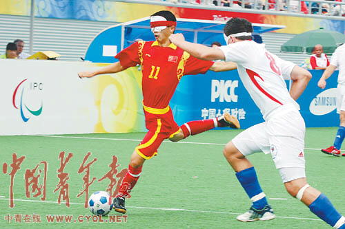 在這短短兩年時間里,中國盲人足球隊從無到有。那些根本無法看到腳下皮球的隊員們,對足球和生活的熱愛是他們每天兩三個小時重復那套固定帶球技術的最大動力。和人們印象中丑陋的中國足球截然相反,無論是前鋒還是后衛,他們帶球行進如行云流水,只要球在腳下,就有足夠的技術和智慧去完成對皮球的控制——本場比賽獨中兩元的王亞峰更是明星中的明星,他在前場毫不停頓的突破讓英國隊的盯人和區域兩套防守陣容形同虛設。