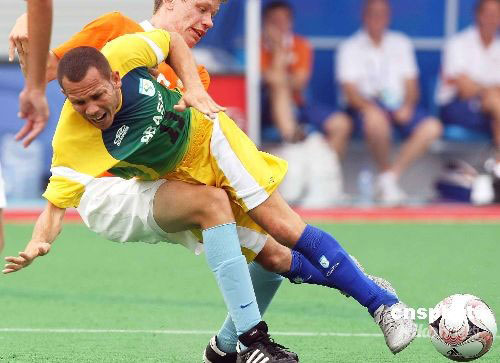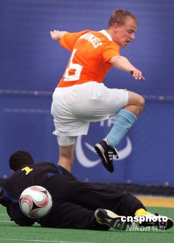 北京殘奧會七人制(男子)足球比賽9月8日在北京奧林匹克公園內的橄欖球場開賽,在一場焦點比賽中,實力強大的巴西隊與荷蘭隊遭遇,最后巴西隊以1比0擊敗荷蘭隊。圖為巴西隊11號若澤·吉馬良斯突破防線后被人高馬大的荷蘭隊5號后衛(wèi)喬伊·門斯放倒。殘奧會七人制(男子)足球比賽在橄欖球賽場舉行,全場共60分鐘,隊員為腦癱患者。中新社發(fā) 任晨鳴 攝