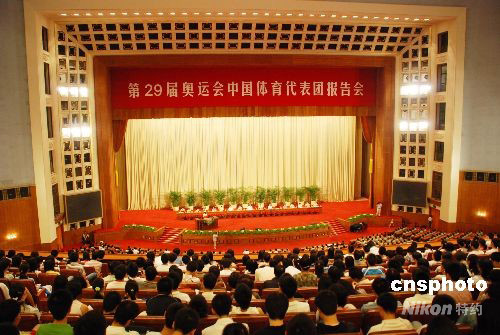 9月11日,由中共中央宣傳部、中央直屬機關工委、中央國家機關工委、教育部、國家體育總局和北京市委聯合舉辦的第29屆奧運會中國體育代表團報告會在人民大會堂隆重舉行。中新社發 楊慧峰 攝