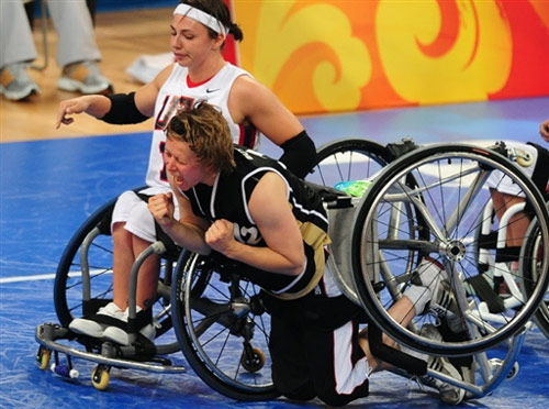 9月8日,在北京殘奧會女子輪椅籃球A組預賽中,美國隊最終以42:38艱難逆轉德國隊。圖為德國隊的瑪倫·巴特布羅特在裁判判罰美國隊斯蒂芬妮·惠勒犯規后,興奮吶喊。