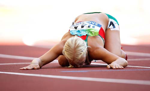 9月12日,在國家體育場進行的北京2008年殘奧會女子200米T38級首輪比賽中,白俄羅斯選手基魯先卡以30秒79的成績晉級決賽。賽后她深情的親吻跑道。新華社記者 廖宇杰 攝