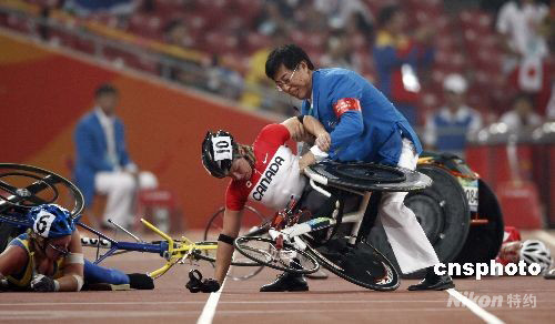 9月8日晚,北京殘奧會田徑比賽女子5000米T54級決賽在北京國家體育場“鳥巢”進行,選手們在比賽中相撞倒地。裁判扶起倒地的加拿大選手特蕾西·弗爾格。