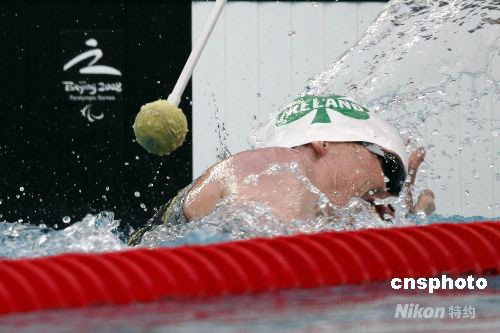 北京2008年殘奧會游泳S11級男子400米自由泳預賽,在北京國家游泳中心“水立方”進行,教練在泳池邊為選手“指路”。中新社發 盛佳鵬 攝