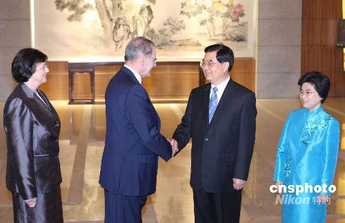 9月17日,中國國家主席胡錦濤與夫人劉永清在北京釣魚臺國賓館芳菲苑舉行宴會歡迎出席北京殘奧會閉幕式的國際貴賓。圖為胡錦濤與夫人迎接國際奧委會主席羅格夫婦。中新社發 廖文靜 攝