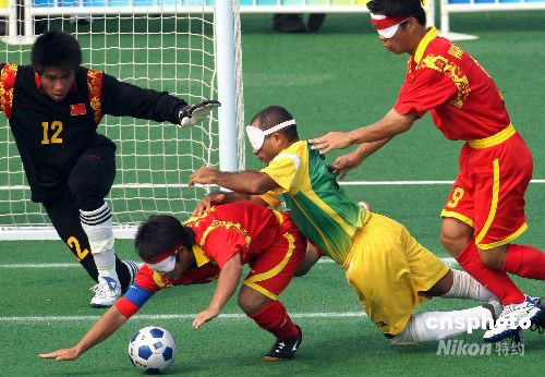 9月17日下午,北京殘奧會五人制足球決賽在北京奧林匹克公園內舉行,雅典殘奧會冠軍巴西隊依靠強大的實力,最后以2比1擊敗中國隊蟬聯冠軍。中新社發 任晨鳴 攝