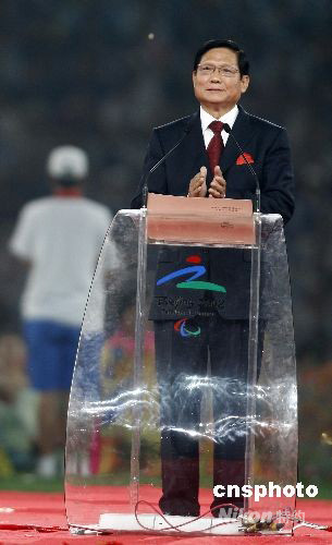 9月17日晚,北京2008年殘奧會閉幕式在國家體育場舉行。圖為北京奧組委主席劉淇致辭。中新社發 杜洋 攝