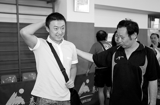 市體校還有一個9歲的“小馬琳”。這個“小馬琳”名叫夏嘉鳴,是馬琳舅舅的兒子。昨天下午,馬琳耐心地教起了“小馬琳”。在與表弟練習了幾下推擋后,張惠忠接過了球拍,而馬琳則站在一邊專心地觀察夏嘉鳴打球。“別緊張,慢慢來!”夏嘉鳴有些緊張,馬琳在一邊輕聲提醒。“手腕再向前送一點。”看著表弟幾次失誤,馬琳走上前去手把手地教。如何評價表弟的水平?馬琳笑了:“現在評價他還早,怎么也要過幾年才能看出來,現在對他來說,最重要的是勤奮。”