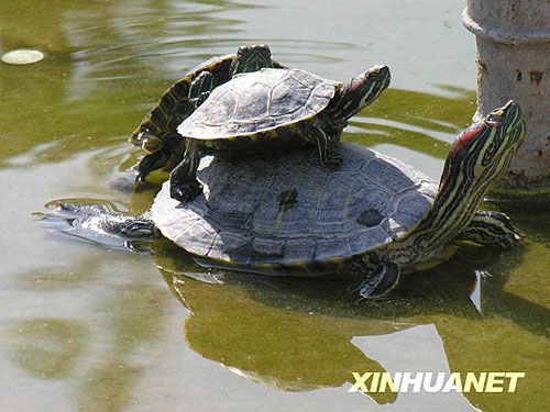 圖:巴西龜放生池內“疊羅漢”