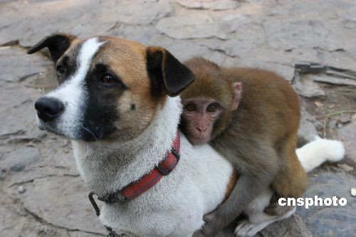 趣圖:猴寶寶認(rèn)狗為“父” 仗狗勢猴山稱“王”