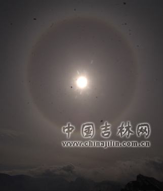 “日暈”多出現(xiàn)在春夏季節(jié)。長白山在深秋出現(xiàn)日暈,更屬難得一見。日暈常常是天氣變化的一種前兆,日暈出現(xiàn)之后,一般都要下雨。10月17日,長白山上是大雪,山下北坡的二道白河、西坡的撫松、南坡的長白及吉林省大部分地方均為大雨,證明“日暈三更雨,月暈午時風”的諺語是準確的。