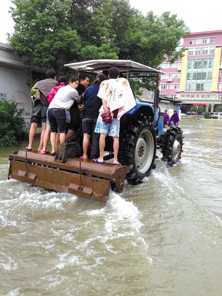 臺風“菲特”帶來的強降雨致使道路成了洼地,過路成了“過河”,給人們出行帶來極大的不便。昨天,鄞州橫溪鎮的小伙子張超,特地開著自家耕田用的拖拉機,來回載著村民們進出村里。