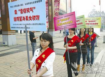 昨日下午,在漢口中山大道大洋百貨附近,4名女青年高舉著印有“賣雷鋒風氣,送明星與美女初吻”的宣傳牌,牌上還有“傳遞人文奧運愛心理念,弘揚和諧社會雷鋒精神”等小字,引得不少路人圍觀。