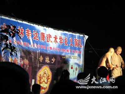 25日19時左右,從南昌西外環高速公路灣里路口來了兩輛掛有河南牌照的車,一輛是臥鋪大客車,一輛是面包車。車子開到灣里區翠園停下后,下來數十名穿著僧衣剃著光頭的和尚。他們自稱是河南“嵩山少林寺達摩武術學校義演隊”,在全國巡回義演和氣功治病,為少林寺募捐。
