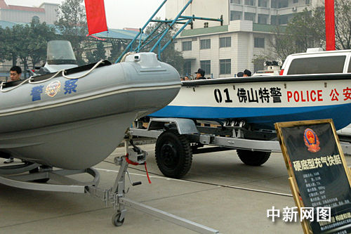 記者在演練現場看到,醒目的標語飄蕩在廣東省佛山市人民警察學校上空,裝備展示區內,具最新科技水平的裝甲車、突擊車、沖鋒舟、機器人一應俱全,各種警備器械令人目不暇接,“科技強警”在佛山成效顯著。