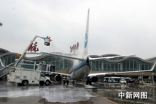 記者在現場看到,2位工作人員正站在除冰車上,拿著類似高壓水槍的工具正對飛機噴解凍液。據現場工作人員介紹,飛機上的冰雪除完以后,就等空管中心通知起飛了。