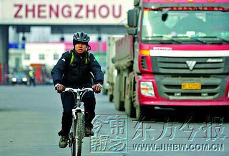 昨日中午12時20分,鄭州北郊黃河大橋收費站,當一個戴著頭盔身背大包的小伙子騎著自行車駛出收費站時,早已在此等候的親朋好友發出一陣歡呼:高富松是全程騎著自行車從北京返回鄭州的,這么惡劣的天氣,這個從未受過相關訓練的年輕人用了一周才走完。