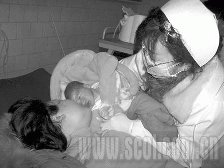 婦產科內,走廊上擺滿了蜂窩煤灶,上面烘烤的全是嬰兒的尿布。待產室門外,一個花甲老婦和一名中年男子,正焦慮不安地徘徊,不時通過門縫往里看。原來,花甲老婦名叫朱惠富,是產婦張大先的母親。中年男子胡成,是張的丈夫。“幸好醫院有臺大功率的發電機喲,要不然我媳婦和娃娃可慘了。”胡成說,“我媳婦進去都1個小時了,還沒消息,急死人了。”“你想要個兒子還是女兒?”“兒女都一樣,只求母子平安。我把名字都給他們取好了,如果生的是兒子,就叫胡斌。女兒,就叫胡蝶。”