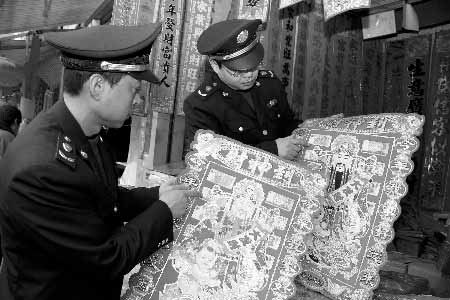 執法人員立即讓該店停止銷售行為,質問其是否知道把人民幣圖樣印在年畫上是違法行為時,店家連說不知道,說年畫上印上人民幣就圖個吉利。在隨后的檢查中,執法人員發現許多年畫上都印有人民幣圖樣,而店家卻無一知曉這是違法行為。“我們只是覺得吸引客人,大家都圖個財源滾滾,真不知道這是違法的。”一家年畫店的張姓老板說。