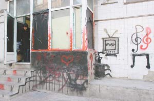 按照市民所說的地址,記者找到了位于惠民路附近的這間“恐怖屋”,它位于一樓,為臨街的門市房,樓的外墻皮上還貼著一些瓷磚,這是以前搭在樓邊的“三小”被扒之后留下的,“三小”被扒后,貼在樓墻皮上的瓷磚未被摳下,外墻瓷磚上噴畫著一些類似電視、音符的圖案,還寫著英文“LES”。記者看到,門邊還寫著“男士禁入”幾個字,門玻璃上貼著黑紙,房間靠北邊的窗戶開著,但里面掛著窗簾,房間南窗戶下邊的墻壁上寫著“請勿偷看”,這幾個字的底色是紅色,外面又噴了一層黑色,看上去確實挺恐怖的。