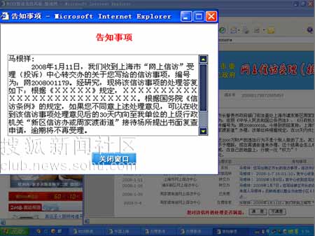 本報記者隨即與馬先生取得聯(lián)系,他當著記者的面,用記者的電腦打開了在 “中國·上海”政府網(wǎng)站上的信箱。記者看到信箱內(nèi)有自去年至今的來往信件,這些信件均反映周家渡街道侵占東明家園公建配套設施事宜。記者點擊了今年5月4日收到的標題為 “周家渡街道網(wǎng)上信訪中心處理答復 ‘馬根祥2008年1月11日……’”標題的回復信件,在彈出的窗口中,被馬先生稱為 “史上最牛”行政回復隨即呈現(xiàn)在記者眼前: