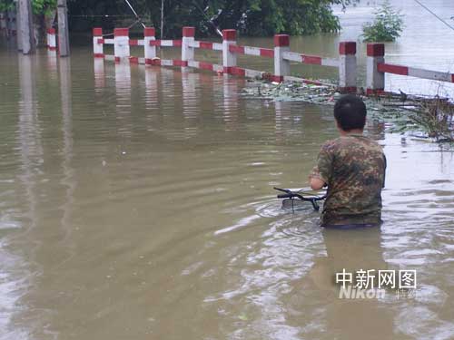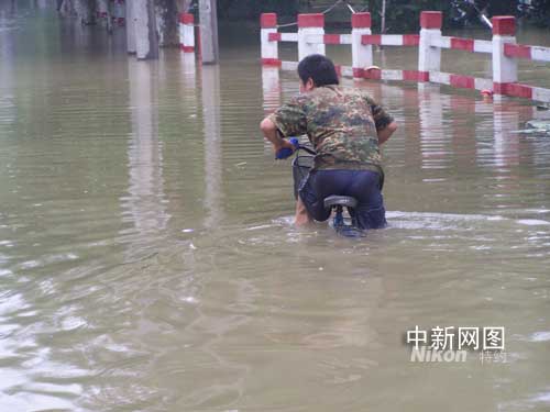 記者跟隨當?shù)卣ぷ魅藛T乘坐沖鋒舟慰問救助留守居民途中,在當?shù)匾巡糠直谎蜎]得西溪街,一身穿迷彩服、短褲的中年男子騎著自行車順著街道水面駛來。讓人驚嘆的是,自行車車身完全淹沒在水中,人們從上面只能看到水中的車把手。該男子笑著對工作人員打了招呼,擦船而過,駛過一段路之后,自行車車身才逐漸露出水面。
