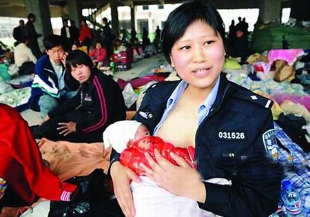 地震發(fā)生后,被轉(zhuǎn)移來的嬰兒除了可以喝一點水和稀飯外,沒有其他東西可吃。“大人還可以餓、還可以忍,而這些小嬰兒卻不能餓、不能忍!作為母親,我覺得這些孩子太可憐了。正好我還在哺乳期,就讓我來給他們喂奶吧!”在受災(zāi)群眾安置點協(xié)助工作的29歲民警蔣曉娟提出:我去給這些嬰兒哺乳!