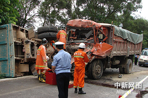 中午12時20分,藤縣消防大隊接警后迅速出動2輛消防車、1輛指揮車和16名消防官兵趕往事故現場進行救援。現場2輛貨車、1輛出租車相撞后受損變形,碎玻璃滿地,一片狼藉。一貨車內,一名中年女子臉色蒼白,受傷嚴重,不時發出痛苦的呻吟聲。該女子下半身被變形的車頭死死“咬”住,動彈不得,而駕駛室內的駕駛員也已經昏迷,現場情況十分緊急。