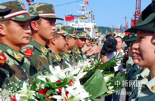 26日下午3時30分,三艘海警艦艇緩緩靠上碼頭,執行安保任務的海警艇編隊總指揮、省公安邊防總隊副總隊長毛正洪等官兵走下艇,與闊別數月的戰友們握手、擁抱。10名戰友上前向執行奧運安保任務的海警代表敬獻了鮮花。