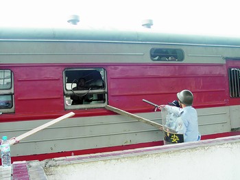昨日清晨6時57分,由廣州開往長沙的5362次列車到達長沙車站,停靠在三站臺五道。長沙車站派出所民警戴戈與列車乘警辦理完交接手續后,接到該車行李員陽小華報告,稱當日6時許,該次列車到達株洲裝卸完行李準備開車時,突然沖上來一名穿白T恤的中年男子,“撲通”一聲跪倒在他面前,稱有人追殺他。同時,該男子手持深圳至婁底的車票。男子上車后一直躲在行李后,充滿恐懼,經行李員多方勸解無果。列車終到長沙車站后,該男子將行李員趕下車廂,將行李車廂的正門反鎖,將通道門用貨物堆碼封閉,并手持一根釘有鐵釘、長1.5米的粗木棒揮舞,不許任何人靠近。