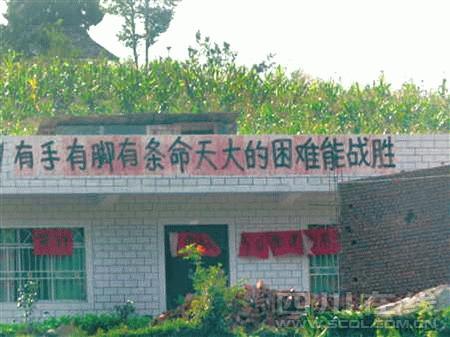 石光武是兩條標語的原創者之一,另一位原創者是棗樹村村委會主任雍明。“地震后,大家碰面都會說幾句鼓勵打氣的話,我就想選幾句寫成標語,鼓勵大家不等不靠,自己動手重建家園。”石光武的話和另一句被村民經常掛在嘴邊的話被雍明選中。7月下旬,“出自己的力,流自己的汗,自己的事情自己干”、“有手有腳有條命,天大的困難能戰勝”兩條標語分別貼在村民尚元進和村民李玉明家墻上。