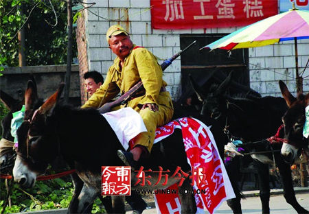 這支“耀武揚(yáng)威”的隊(duì)伍由四名身穿日本帝國(guó)主義軍裝、騎著毛驢的男子組成,由于他們牽的毛驢有十多頭,所以隊(duì)伍有二三十米長(zhǎng)。在隊(duì)伍前方,一輛面包車上還有一支樂(lè)隊(duì),嗩吶聲、镲鈸聲不絕于耳,場(chǎng)面著實(shí)壯觀。