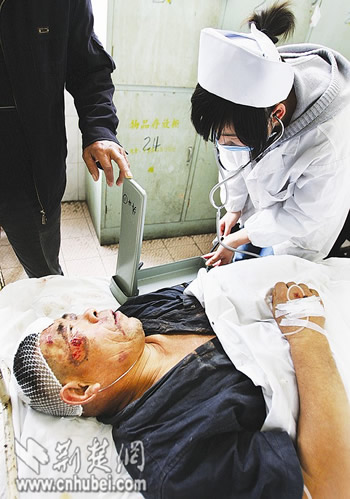 昨日中午,記者在漢川市人民醫(yī)院,見(jiàn)到了顱骨骨折的鄭某(如圖)。據(jù)他的親屬介紹,該村距武荊高速公路約200米。3日晚,他們討說(shuō)法時(shí),遭施工人員毆打,其中一人顱骨骨折,多人身上有棒傷。