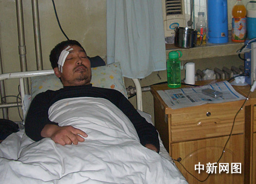 記者在石家莊市第二醫院骨科ICU病房見到霍辰輝時,他的眼部因縫合傷口還蒙著紗布,頭部被打部位還沒有消腫,因腰椎骨折不能下床的霍辰輝無奈地講述著那天的遭遇。