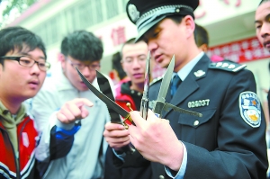 即日起至12月20日,警方和(北京)市教委聯合在本市大、中、小學校收繳管制刀具,并清理校園周邊販賣管制刀具的攤販。前天,西城警方率先走進北京實用美術學校,通過真實的案例和實物,向學生宣傳什么是管制刀具,管制刀具有什么危害,呼吁學生配合此次收繳行動。