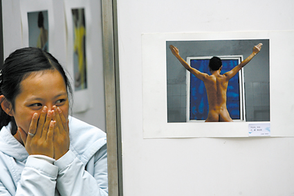 昨日上午,小吳等同學的作品公開擺放在了校園操場邊進行展示,路過的學生們不敢走近觀看,后來見人逐漸多了起來,才靠近觀看。記者注意到,幾乎所有的作品都是裸體藝術照,其中《自·私·戀》搶人眼球,畫面中,兩名赤裸的男同學背靠背或是坐在一起,或是蜷縮一團,創(chuàng)作者徐善軍告訴記者,這體現(xiàn)出同性戀者對異樣愛情的憧憬。據(jù)介紹,班上50多名同學響應了這次活動,26人公開展示,包括5名女生。