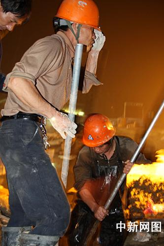 熟悉現(xiàn)場情況的工人正在尋找可能存活的工友。作者:張兆嶺