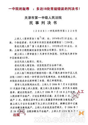 一篇名為《天津某法院多達18處低級錯誤的終審判決書》出現(xiàn)在某論壇上。一位網(wǎng)名是“哭泣不是懦弱”的發(fā)帖人在帖子中寫道:“這是我2008年11月7日領到的法院終審判決書。一份僅6頁的判決書,光錯別字、丟字等低級錯誤就有18處。這樣一份錯誤百出的終審民事判決書還赫然蓋上了"××法院"的公章。難道法官就是這樣的工作態(tài)度嗎?法律的權威與神圣蕩然無存!”