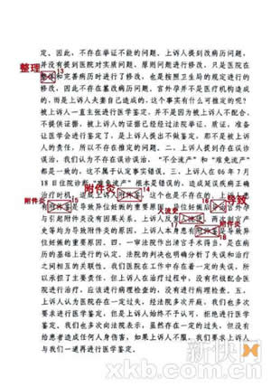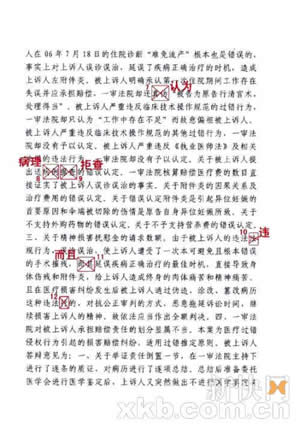 記者在判決書掃描件中的確發(fā)現(xiàn)不少筆誤,比如把“導致”寫成“導治”、“人工流產(chǎn)”寫成“工人流產(chǎn)”、“附件炎”寫成“附件驗”和“附件鑒”、“被上訴人”寫成“被上訴們”、“認為”寫成“真?zhèn)巍保熬懿椤睂懗伞皳?jù)查”、“整理”寫成“整體”、“人流史”寫成“人流使”等。