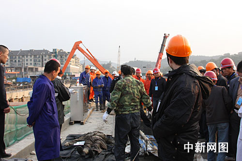 中新網(wǎng)杭州11月18日電(記者江耘 柴燕菲 實(shí)習(xí)生 孫寧亞 陳穎) 11月18日下午3點(diǎn)34分左右,記者在杭州地鐵施救現(xiàn)場(chǎng)看到,施救人員在地鐵坍塌現(xiàn)場(chǎng)將第一具遇難者尸體打撈上來(lái)。這是今天發(fā)現(xiàn)的第一具遇難者遺體。到目前為止,從基坑中共打撈出六具遺體。