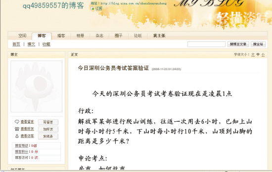 深圳公務員筆試在本月23日進行,24日一早就有考生對記者反映:今年深圳公務員考試題泄露了,他已經在網絡上見到了標題為“今日深圳公務員考試答案驗證”的博客日志,顯示的發帖時間是23日的凌晨1時24分。該帖發布試題行政部分與“申論:房市、如何救市”的試題與他參加考試的試題完全一樣。