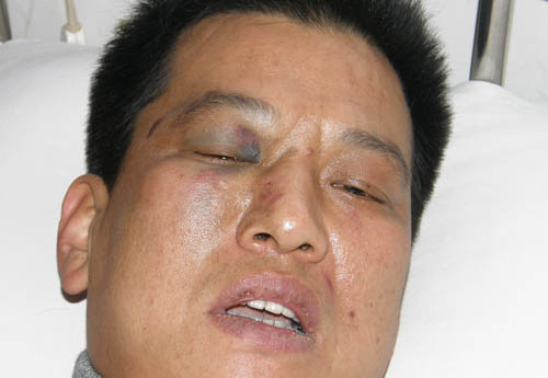 據他回憶說,12月15日下午,我在杜康花園小區尚要武家等車去灌液化氣,大約4點鐘左右,一伙不明身份的人(后獲悉是該縣刑警)闖進家中,一人摟著我脖子用手槍指著我頭不讓動,將我摔在地上,另一人將我皮帶抽掉,又把鞋子脫掉,對我搜身,將電話拿走,我說我沒辦違法事,控制我的人用手槍在我頭上砸了兩下說:“不準說話,不許動。”此人用膝蓋頂著我脖子,我呼吸困難,我說我出不來氣,掙扎了一下,此人用槍在我頭上砸了一下,又有一人在我胸口跺了兩腳,走到我左側朝我面部、頭上猛跺,隨后將我背銬手銬塞上車(非警車)。