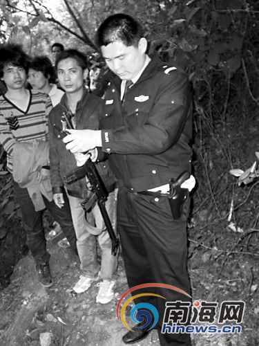 14點(diǎn)20分,為確認(rèn)山坡上的水牛是否被擊斃,一名民警前往山坡查看,為保證安全,這名民警挎上了一支沖鋒槍。
