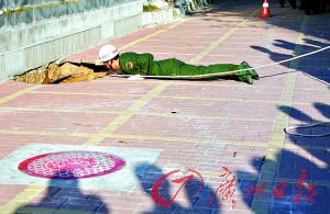 昨天下午4時(shí)20分許,珠海海燕路名亭公園巴士站附近上演驚險(xiǎn)一幕,小張和女朋友路過此處時(shí),人行道路面突然塌方下陷,兩人猝不及防雙雙掉進(jìn)深坑。小張掉進(jìn)去不太深,而身旁的女朋友掉進(jìn)去后,因?yàn)槟_底的土地下陷太深一時(shí)不知所終,小張掙扎著爬出路面,急忙報(bào)警救助。