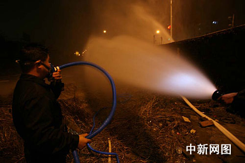 晚上七時許,記者趕到事故現(xiàn)場,空氣中彌漫著難聞的煤氣味。為防止意外,泄漏點江北大道前后500米已被交警部門拉起長長的警戒帶。由于封道,警戒線外汽車排起了長龍,一眼看不到底,圍觀者眾多,整條環(huán)城北路幾乎癱瘓,十幾名交警正在現(xiàn)場指揮疏散。而在警戒帶內200米,消防部門正在下風方向設置了三道水幕水帶,對泄漏的煤氣進行稀釋。