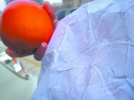“網友們說,有些商販為了讓橙子色澤更漂亮、賣相更好,就把色素注射到橙子皮里,再在皮上打些石蠟,使橙子看起來很新鮮,但這樣的橙子會‘掉色’。”許女士說,她用紙蘸了些水,在還沒食用的橙子上擦拭,“紙變成紅的了,我又用手去擠剝下來的橙子皮,流出來的水也是紅的。”