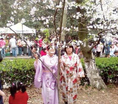 下午3時左右,兩個穿日本和服的女子出現在櫻花大道上,年紀較長的穿了件淡紫色和服,另一年輕女孩穿一件彩色和服,兩人站在櫻花樹下合影留念。給她們拍照的是一位中年男子,隨行的還有一位年輕女子。4人都操武漢口音,在櫻園逗留了近10分鐘,引來很多賞花市民的目光。