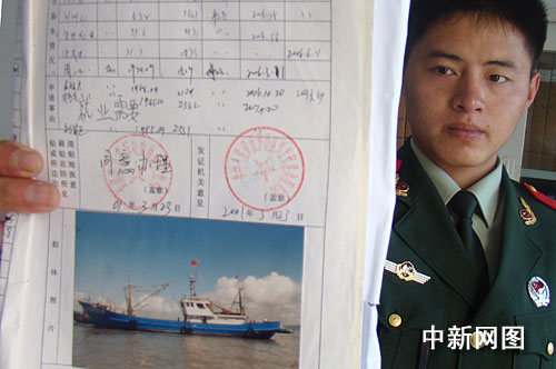 邊防官兵展示浙玉漁5212號漁船的船舶檔案