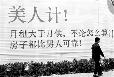 根據何先生所提供的線索,記者在河醫立交橋向西約1000米的棉紡東路上,看到了這則面朝南的巨幅房產廣告。白色布景的廣告墻上赫然寫著那句讓何先生不爽的廣告。該廣告美其名曰“美人計”,是為“粉領公寓”做的廣告,從廣告語來看,其目標消費群是女性。