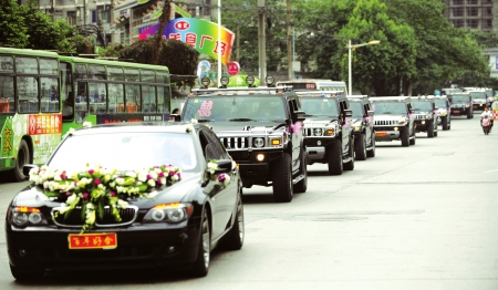 新郎朱先生告訴記者,他與新娘賈小姐屬于一見鐘情,相戀一年多才結(jié)婚,用悍馬車當(dāng)婚車的創(chuàng)意來(lái)自朋友。“除了寶馬7系是我的,悍馬車全是朋友們的。”朱先生說(shuō),在婚禮前一個(gè)月,他開始四處找朋友借車,婚禮前一周汽車全部集結(jié)到位。