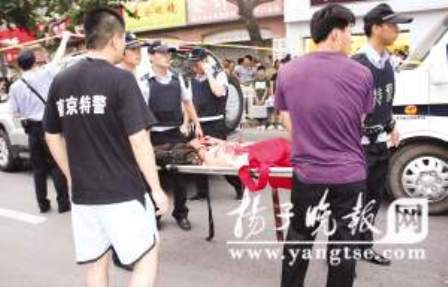 昨天下午5點多,南京玄武區太平門街10號某食品店內發生一起血案,一名男青年持刀捅了一位女高中生十幾刀,然后將該學生劫為人質。5:42,警方接報警趕到現場。在僵持了近一個小時后,警察兩槍命中劫犯。據了解男青年籍貫貴州,姓余;被捅女學生是南京34中高一學生,姓房。兩個人之前是在網上認識的,根據警方信息,血案系兩人戀愛關系破裂而引發。